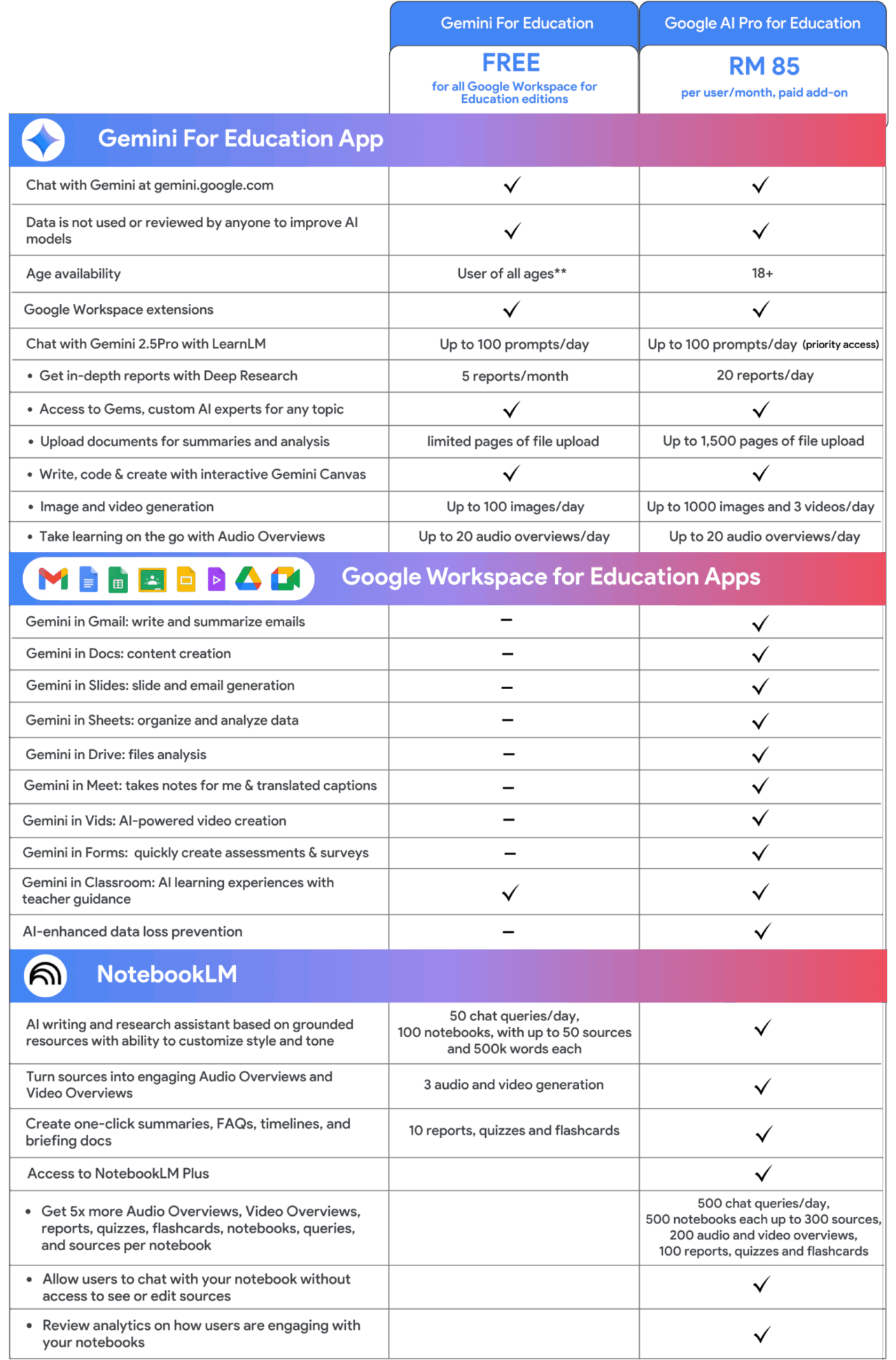 Take your educational technology further with Google AI Pro for Education. This upgrade gives you expanded capabilities designed to boost productivity and innovation across your entire institution with Gemini in Workspace apps, like Gmail and Docs, and expanded access to premium models and features in Gemini and NotebookLM.