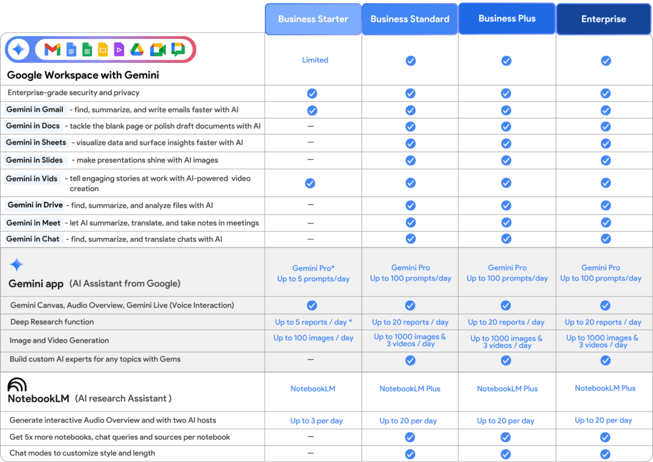 Google Workspace plans now include access to the Gemini app, NotebookLM and Gemini in Gmail, Docs, Meet and more.