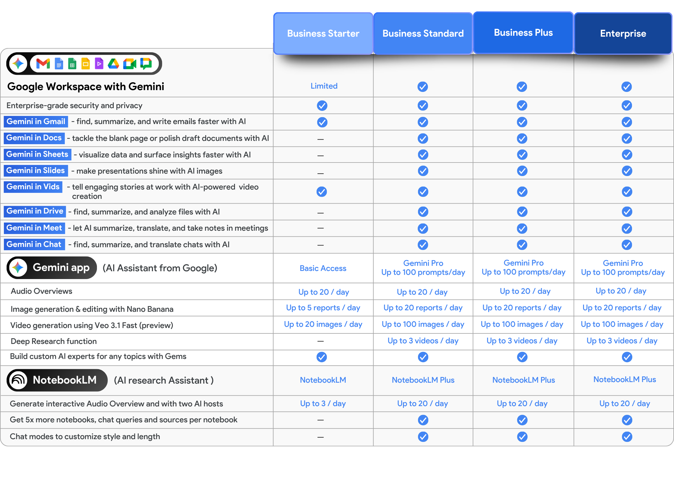 - Gemini AI assistant in Gmail, Docs, Meet, and more